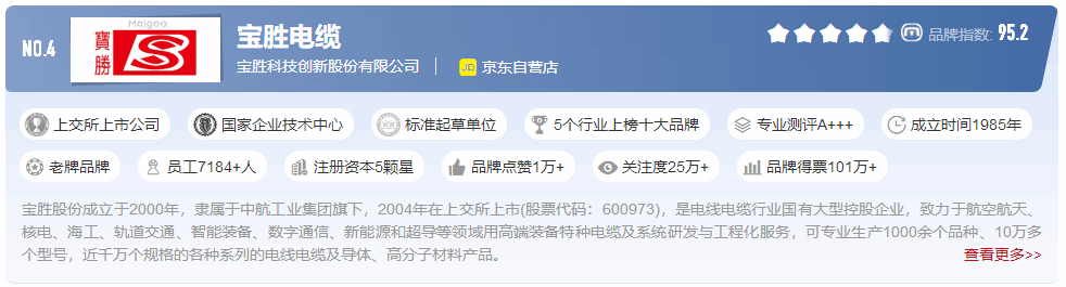 品牌介绍:宝胜科技创新股份有限公司是中国航空工业集团公司旗下的上市公司,于2004年8月在上交所A股上市,是中国电线电缆行业国有大型控股企业。宝胜股份坚持以持续技术创新为客户不断创造价值,公司构建了技术委员会、技术中心、产品研发部三级技术创新体系,拥有国家认定企业技术中心、博士后科研工作站、国家高压电力电缆工程中心、江苏省电线电缆工程技术研究中心、江苏省特种电缆材料及可靠性研究重点实验室等创新平台。