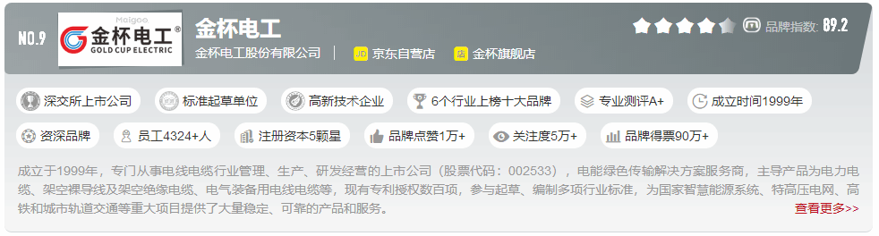 品牌介绍:金杯电工股份有限公司前身成立于1999年9月,2004年5月改制为股份有限公司,2010年12月31日在深交所成功上市。作为中西南部地区电线电缆行业领军企业,金杯电工拥有丰富的电线电缆行业管理、生产、研发经营经验,现有专利授权454项,参与起草、编制国家及行业标准28项,主导产品为电力电缆、架空裸导线及架空绝缘电缆、电气装备用电线电缆、绕组线等系列产品。